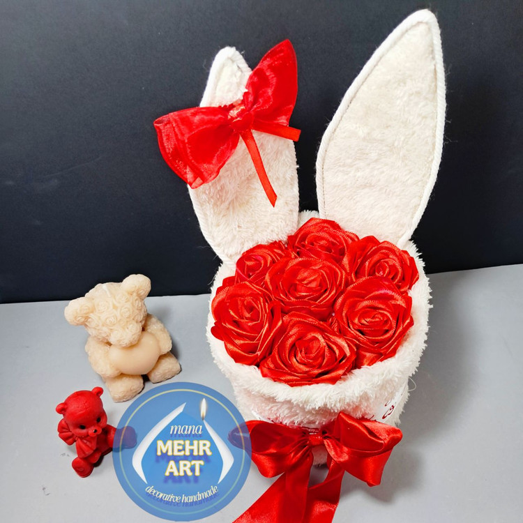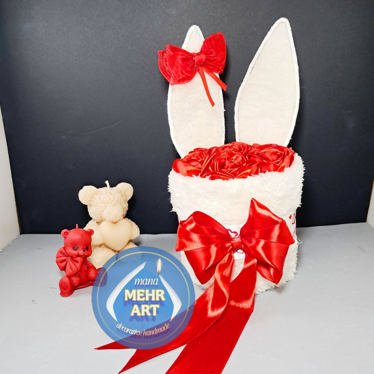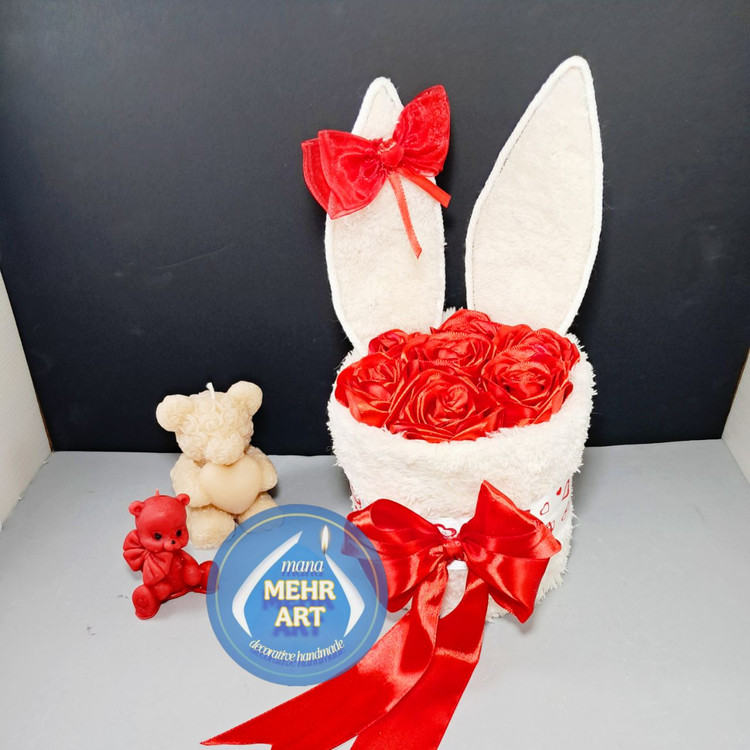 باکس گل طرح خرگوش، جنس روکش باکس، تدی و گلها رز روبانی هستن.